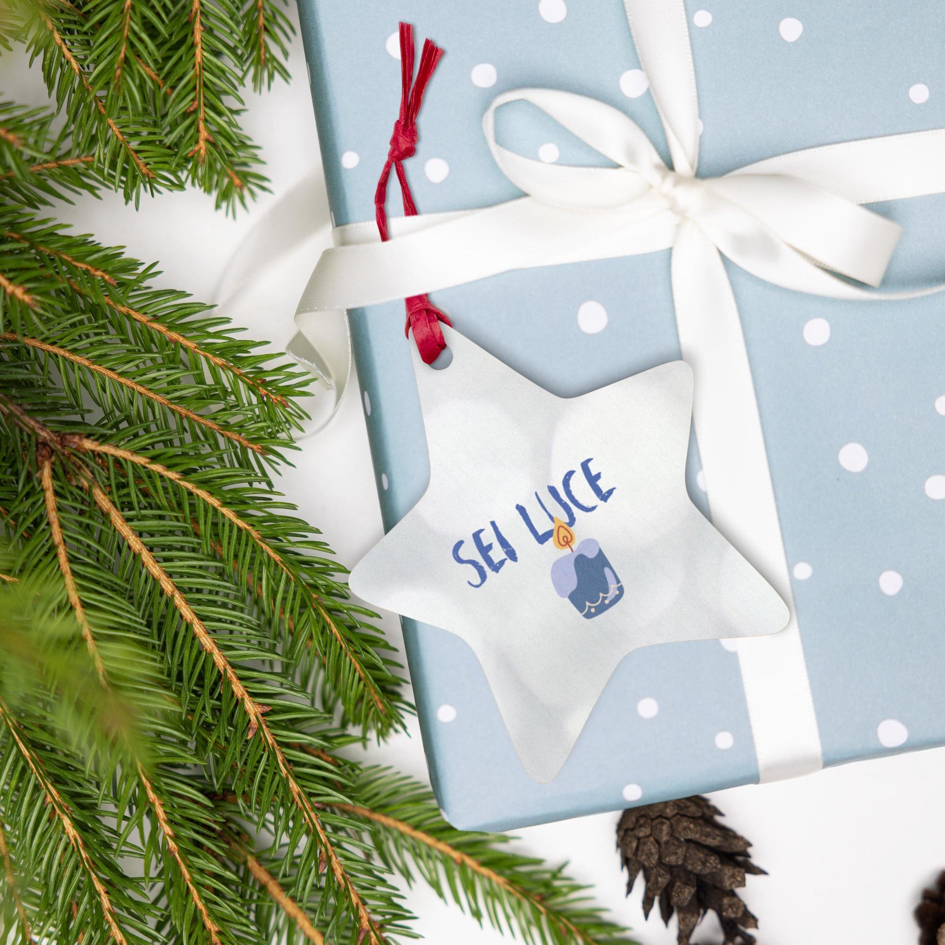 • Dotata di un nastro rosso in carta e di un buco attraverso cui far passare il filo